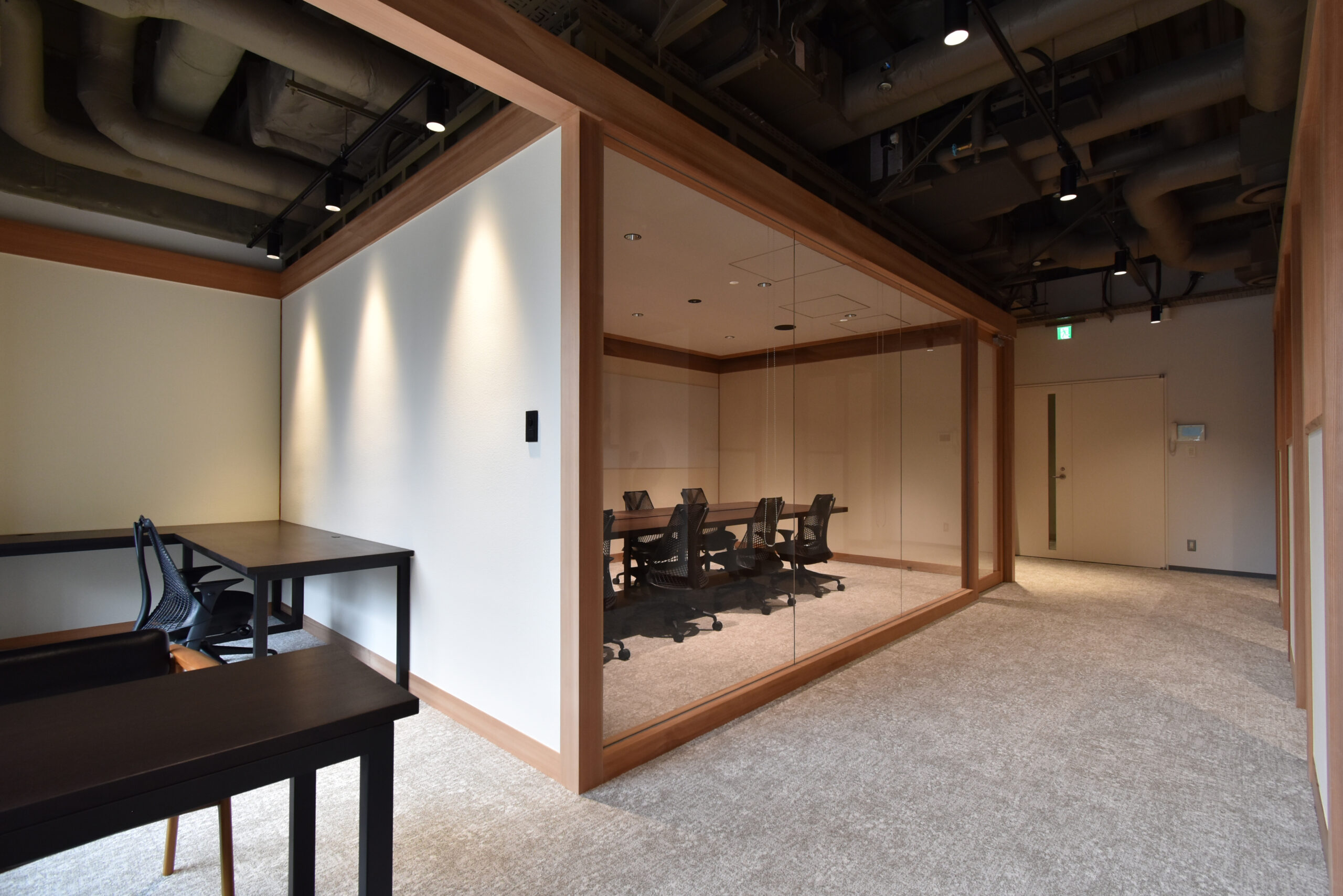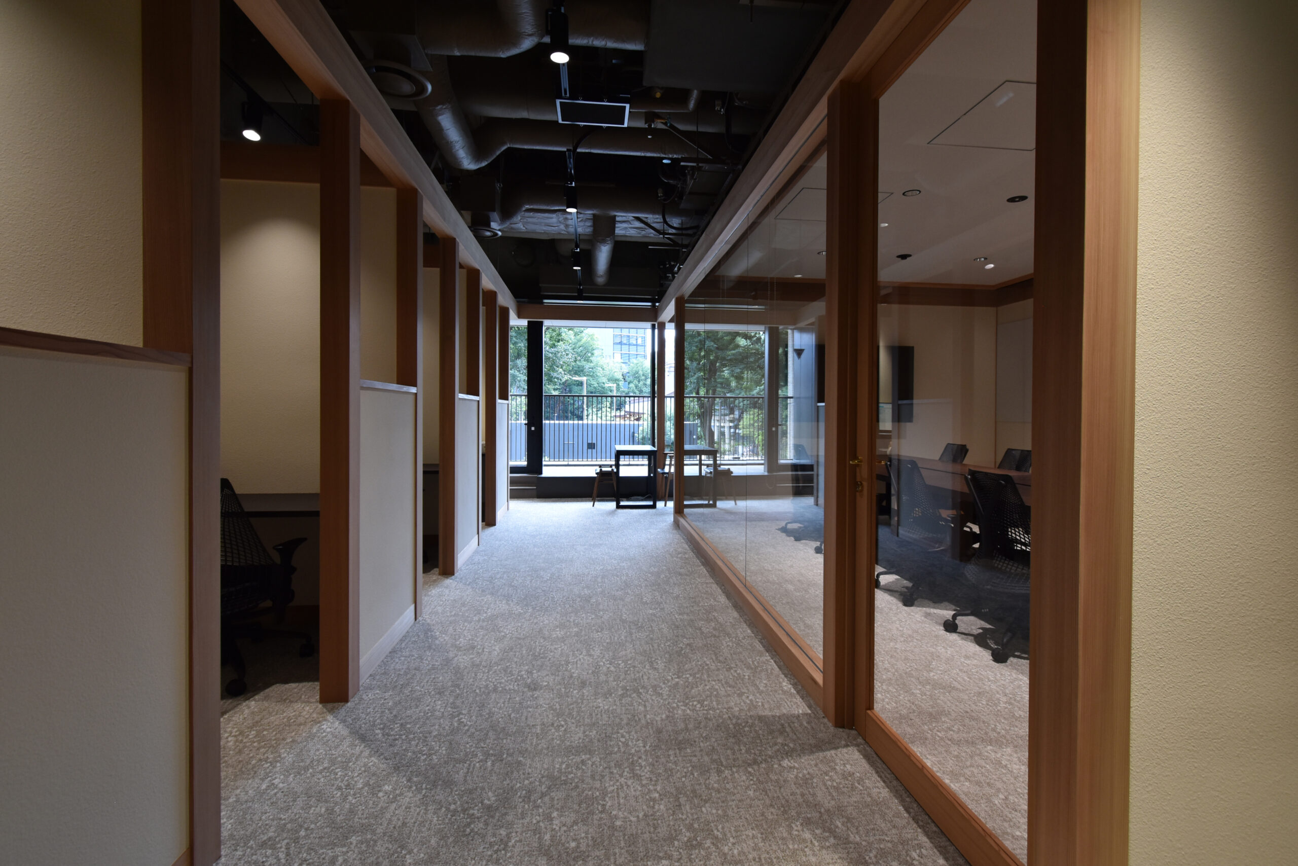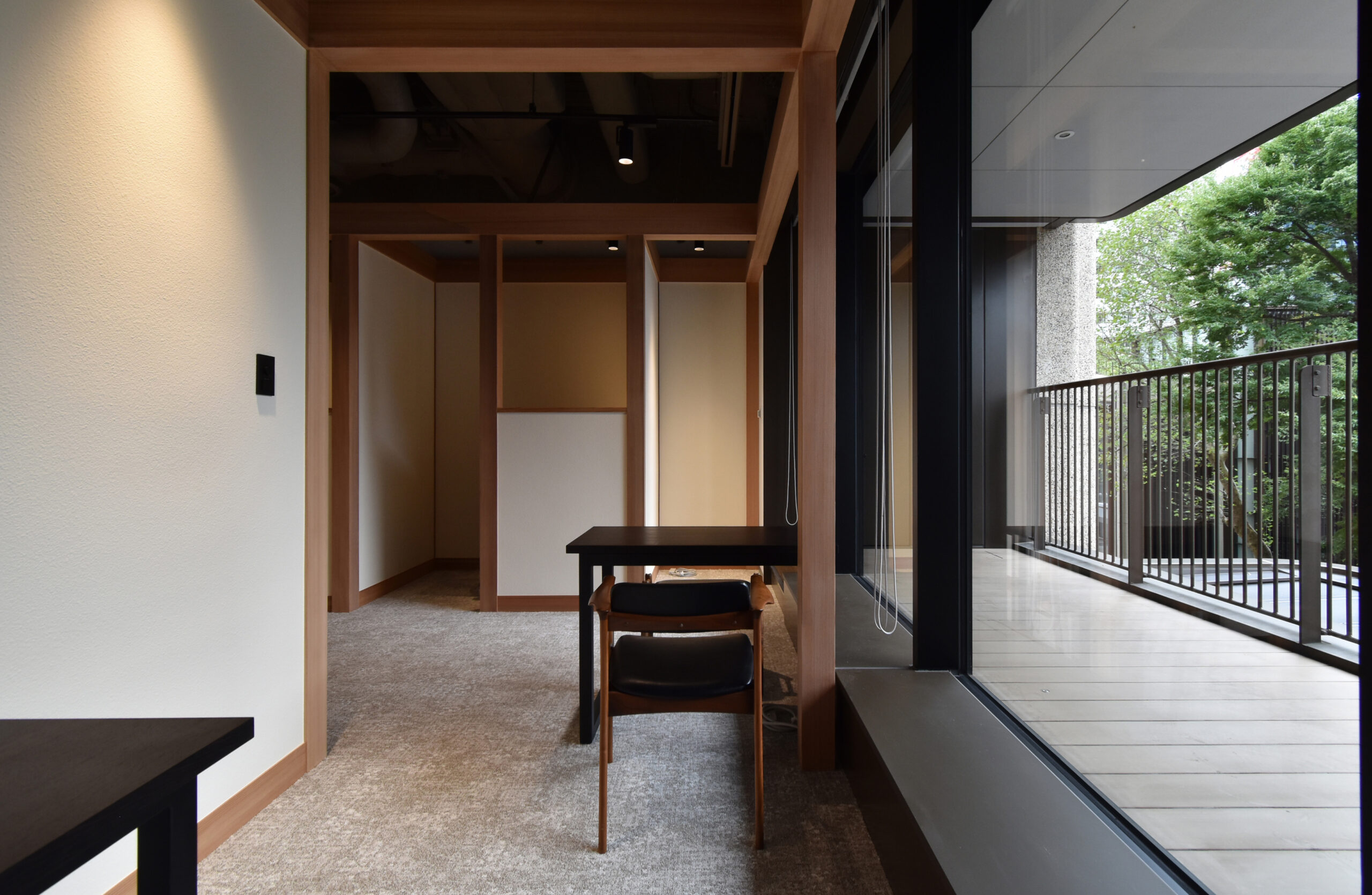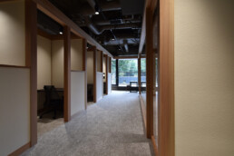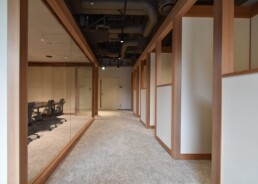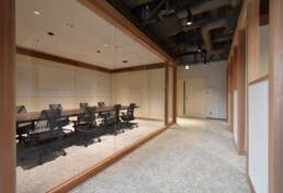 Within a single space, an independent structural frame composed of columns and beams is installed. By connecting these separate structures, rooms and functions are created as entities detached from the existing space. The continuous arrangement of columns and beams evokes the impression of traditional Japanese architecture, conveying the identity of a Japanese company.