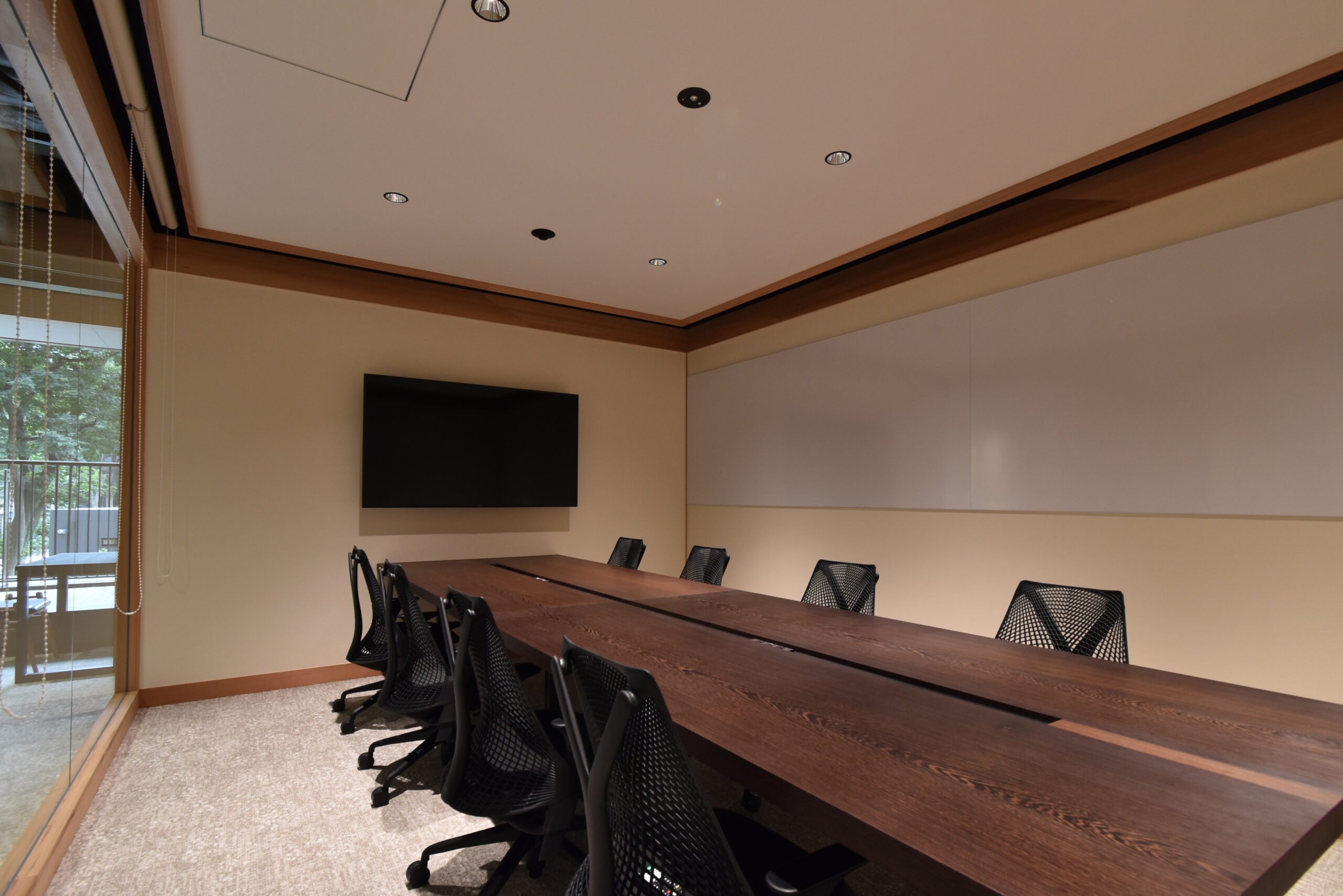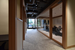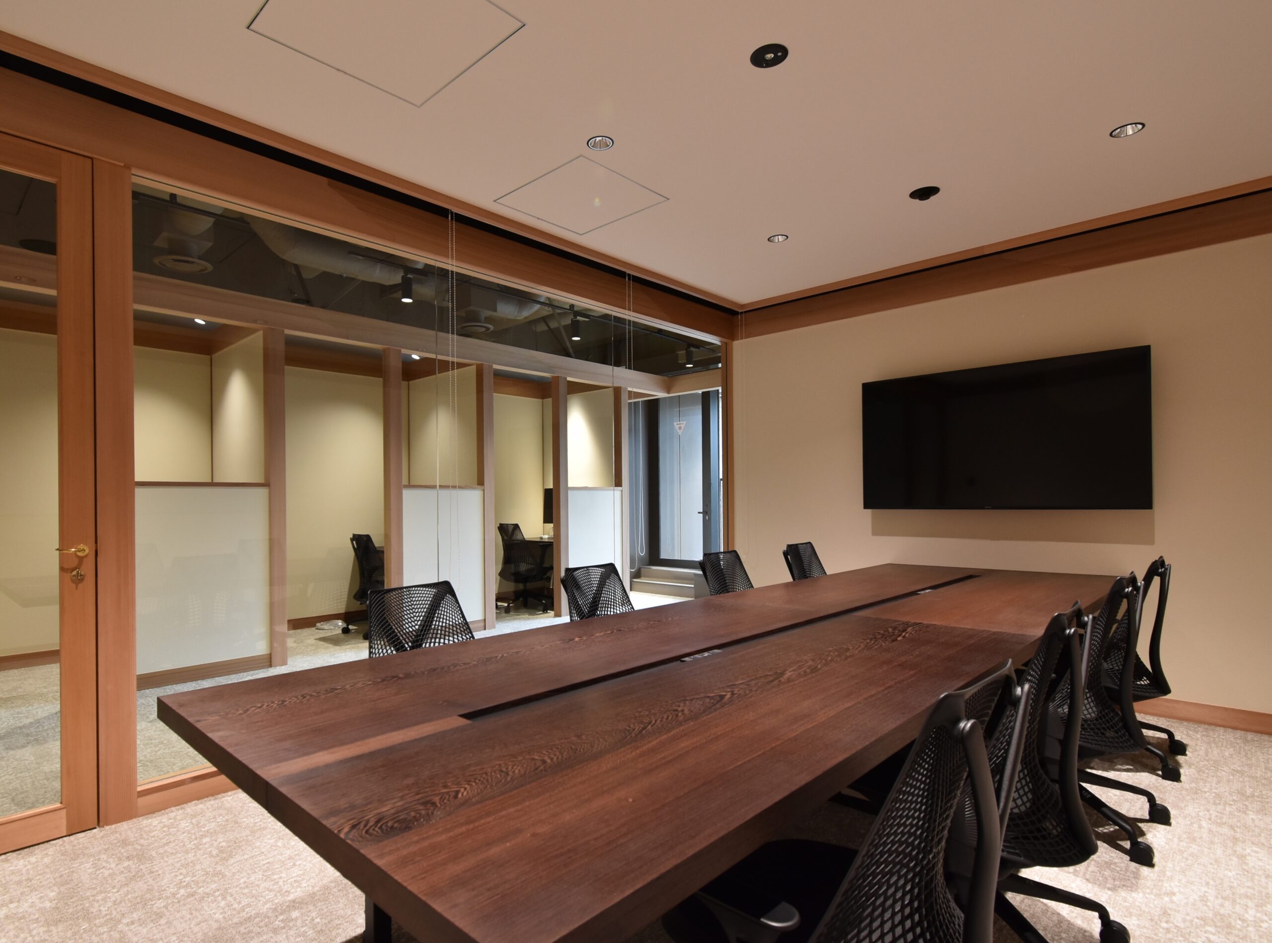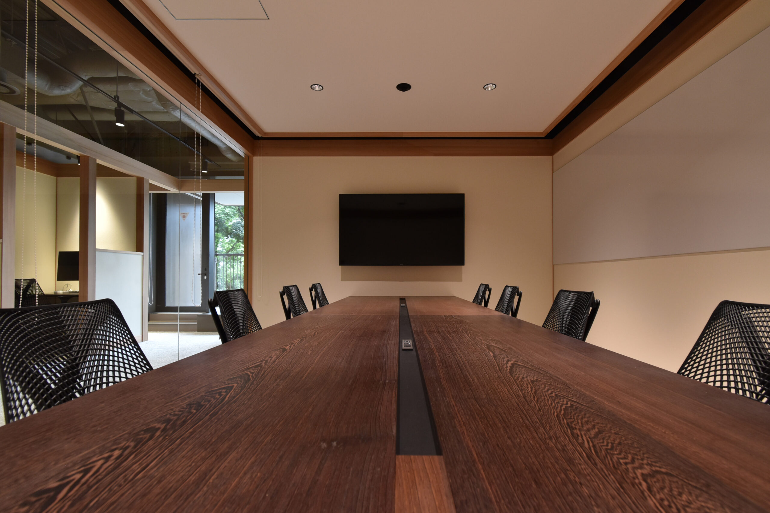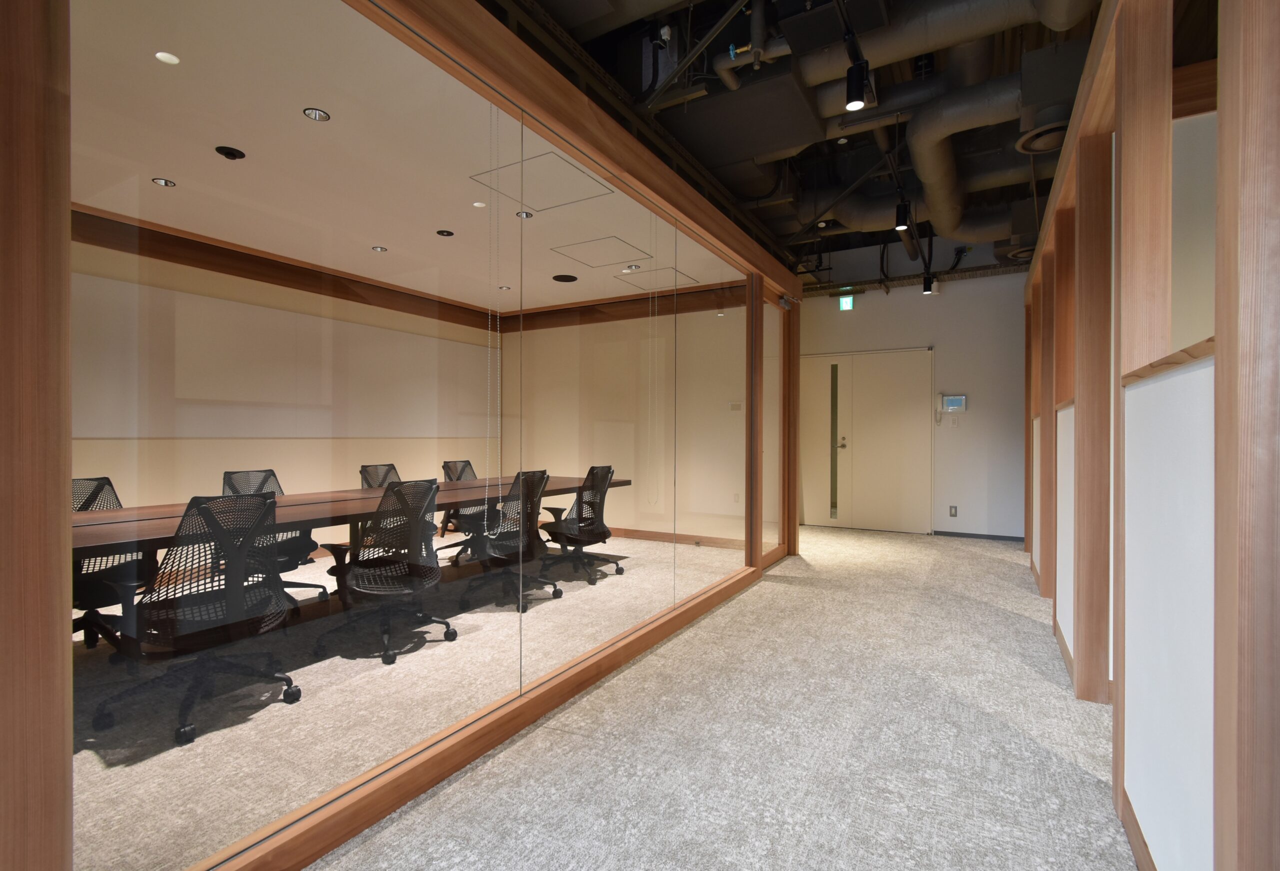 一つの空間内に、柱、梁にて独立した別の構造体をインストールし、その構造体同士を繋ぐことで部屋や機能を既存の空間から離れた状態で成立させている。連続する柱、梁が日本建築の印象を与え、日本の企業であることを感じさせる。機能や部屋の連続性と、緩やかな繋がりによって奥に見える外の自然も感じることが出来る。